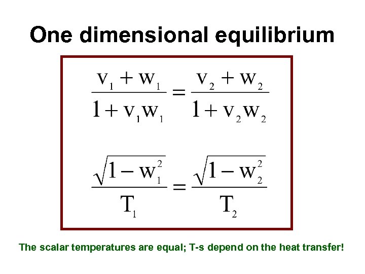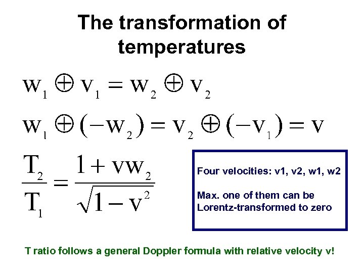 The transformation of temperatures Four velocities: v 1, v 2, w 1, w 2 Max. one of them can be Lorentz-transformed to zero T ratio follows a general Doppler formula with relative velocity v!