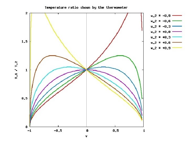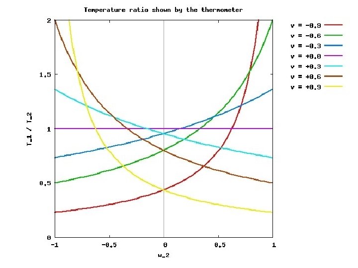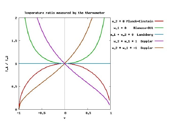 Cases of apparent temperature w 2 = 0 T 1 = T 2 / γ w 1 = 0 T 1 = T 2 γ w 2 = 1, v > 0 T 1 = T 2 ● red shift w 2 = 1, v < 0 T 1 = T 2 ● blue shift w 1 + w 2 = 0 T 1 = T 2 Landau frame: w=0, but which w ?