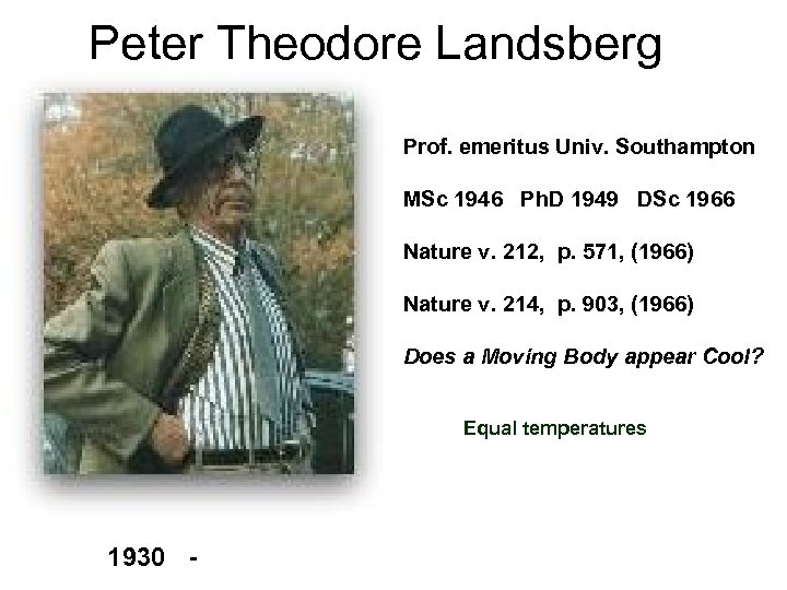 Peter Theodore Landsberg Prof. emeritus Univ. Southampton MSc 1946 Ph. D 1949 DSc 1966 Nature v. 212, p. 571, (1966) Nature v. 214, p. 903, (1966) Does a Moving Body appear Cool? Equal temperatures 1930 -