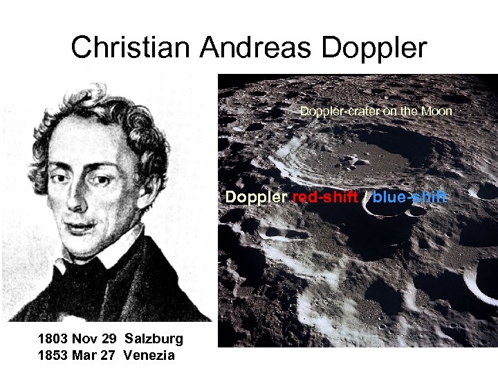 Christian Andreas Doppler-crater on the Moon Doppler red-shift / blue-shift 1803 Nov 29 Salzburg 1853 Mar 27 Venezia