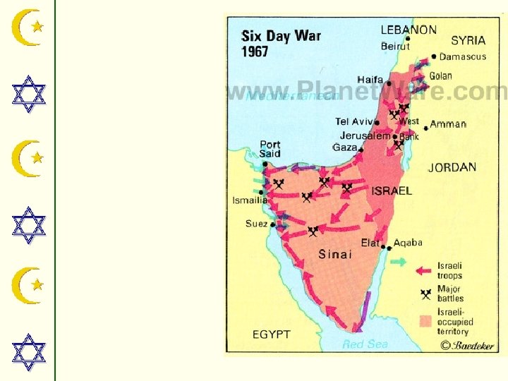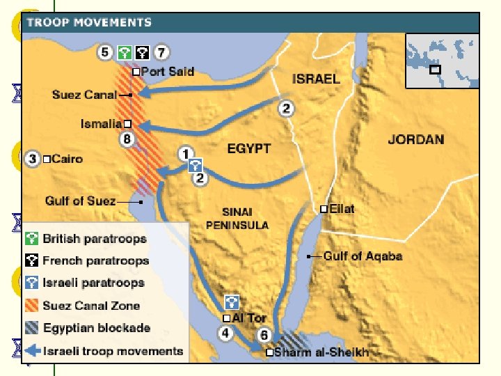 SUEZ CRISIS • Egypt seized control of the Suez Canal from Britain and France. • Egypt also blocked Israel’s use of the Straits of Tiran (their only way to the Red Sea) • Israel, Britain and France made a plan together to attack Egypt