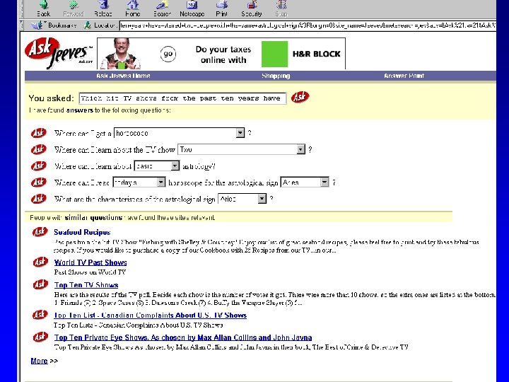 Help find relevant information Combine info. from n sources Back & forth clarification dialogue • content (logical representation of doc/page/. . . ) • context (common sense, recent utterances, …)
