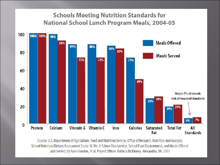 National School Lunch Program: Guidelines In the 2004 -05 school year, 93 -94% of meals failed to meet all nutritional standards, primarily due to not meeting standards for fat, saturated fat, or calories. Most schools offered students the opportunity to select a balanced meal, but few students made the healthful choice. Schools offer few whole grain foods, and french fries and other similar potato products accounted for a disproportionate amount of the vegetable options on school lunch menus. The Institute of Medicine recently provided recommendations for updated nutrition standards consistent with the 2005 Dietary Guidelines In about 90% of all schools nationwide, a student had opportunities to select low-fat lunch options, but in only about 20% of all schools did the average lunch actually selected by students meet the standards for fat increasing the amounts of fruits, vegetables and whole grains; reducing the amount of sodium and saturated fat provided; and setting a minimum and maximum number of calories for school meals. USDA is currently developing a regulatory proposal to guide schools in implementing updated standards.