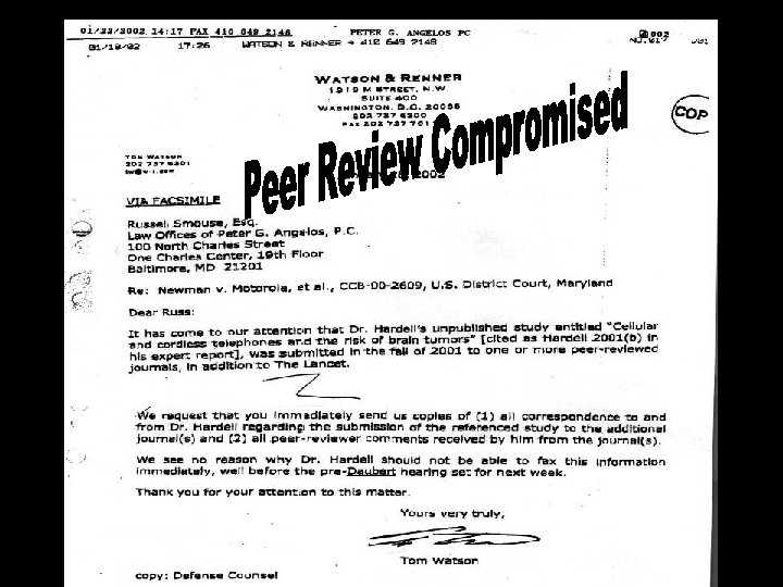 Cell Phone Science Follows Tobacco Playbook • Raise doubts about experimental findings • Fund and develop studies • “War Gaming” of challenging results