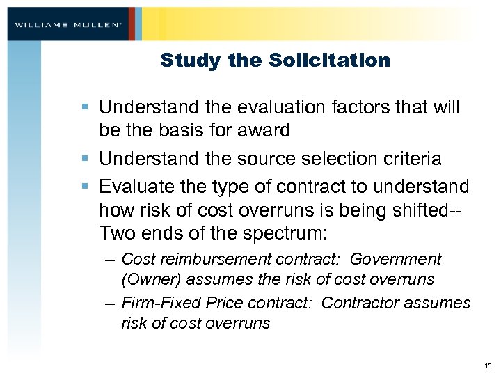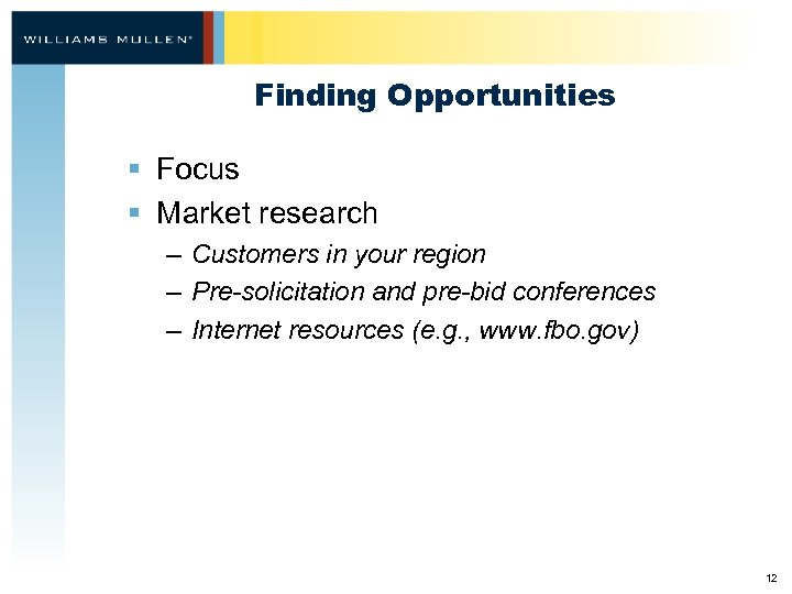 Finding Opportunities § Focus § Market research – Customers in your region – Pre-solicitation and pre-bid conferences – Internet resources (e. g. , www. fbo. gov) 12
