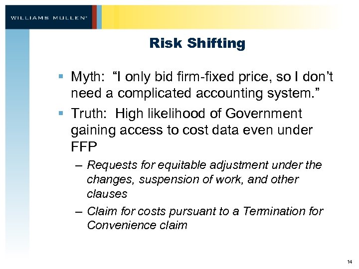 Risk Shifting § Myth: “I only bid firm-fixed price, so I don’t need a complicated accounting system. ” § Truth: High likelihood of Government gaining access to cost data even under FFP – Requests for equitable adjustment under the changes, suspension of work, and other clauses – Claim for costs pursuant to a Termination for Convenience claim 14