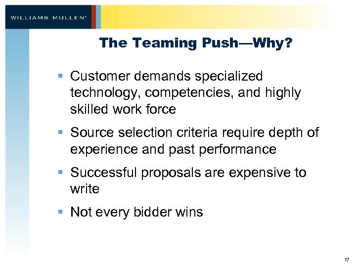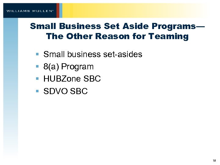 The Teaming Push—Why? § Customer demands specialized technology, competencies, and highly skilled work force § Source selection criteria require depth of experience and past performance § Successful proposals are expensive to write § Not every bidder wins 17