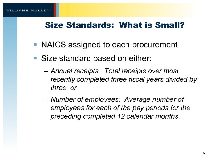 Size Standards: What is Small? § NAICS assigned to each procurement § Size standard based on either: – Annual receipts: Total receipts over most recently completed three fiscal years divided by three; or – Number of employees: Average number of employees for each of the pay periods for the preceding completed 12 calendar months. 19