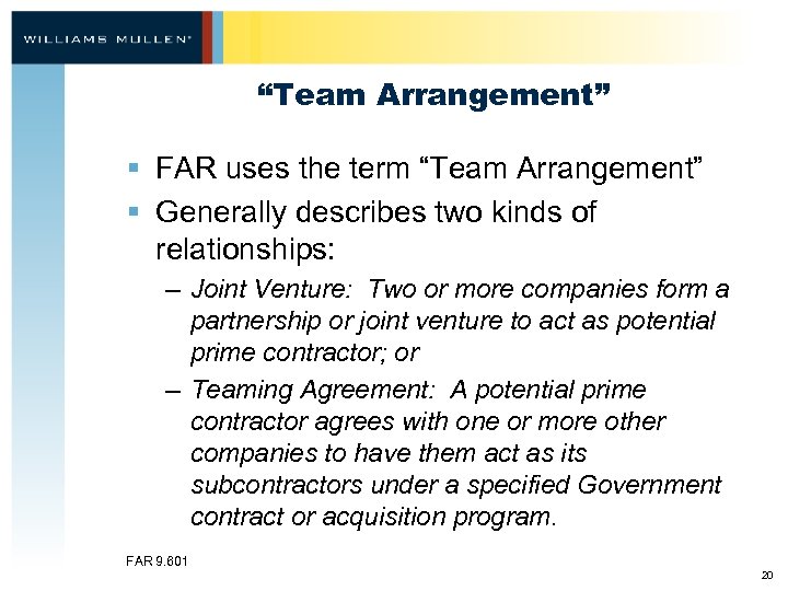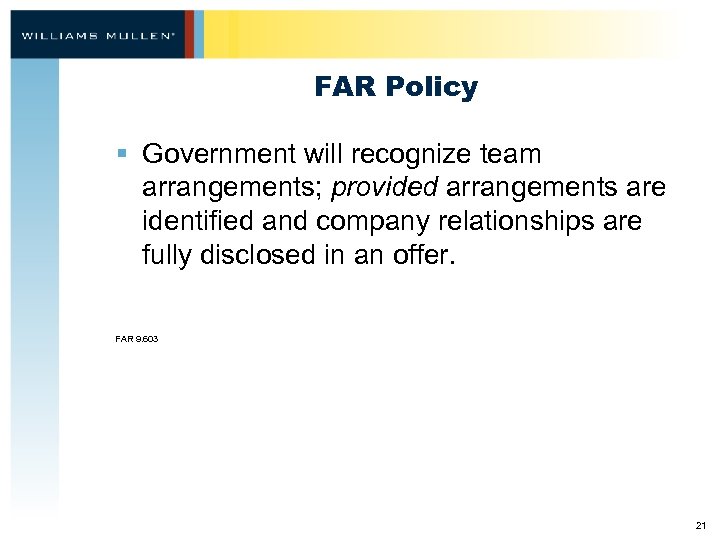 “Team Arrangement” § FAR uses the term “Team Arrangement” § Generally describes two kinds of relationships: – Joint Venture: Two or more companies form a partnership or joint venture to act as potential prime contractor; or – Teaming Agreement: A potential prime contractor agrees with one or more other companies to have them act as its subcontractors under a specified Government contract or acquisition program. FAR 9. 601 20