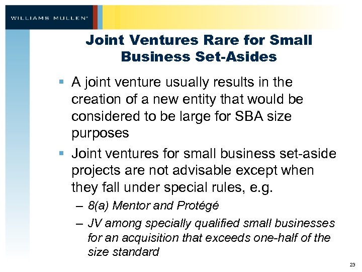Joint Ventures Rare for Small Business Set-Asides § A joint venture usually results in the creation of a new entity that would be considered to be large for SBA size purposes § Joint ventures for small business set-aside projects are not advisable except when they fall under special rules, e. g. – 8(a) Mentor and Protégé – JV among specially qualified small businesses for an acquisition that exceeds one-half of the size standard 23