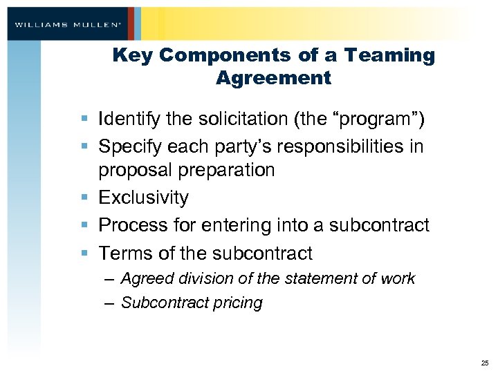 Key Components of a Teaming Agreement § Identify the solicitation (the “program”) § Specify each party’s responsibilities in proposal preparation § Exclusivity § Process for entering into a subcontract § Terms of the subcontract – Agreed division of the statement of work – Subcontract pricing 25
