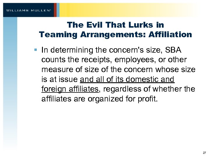 The Evil That Lurks in Teaming Arrangements: Affiliation § In determining the concern's size, SBA counts the receipts, employees, or other measure of size of the concern whose size is at issue and all of its domestic and foreign affiliates, regardless of whether the affiliates are organized for profit. 27