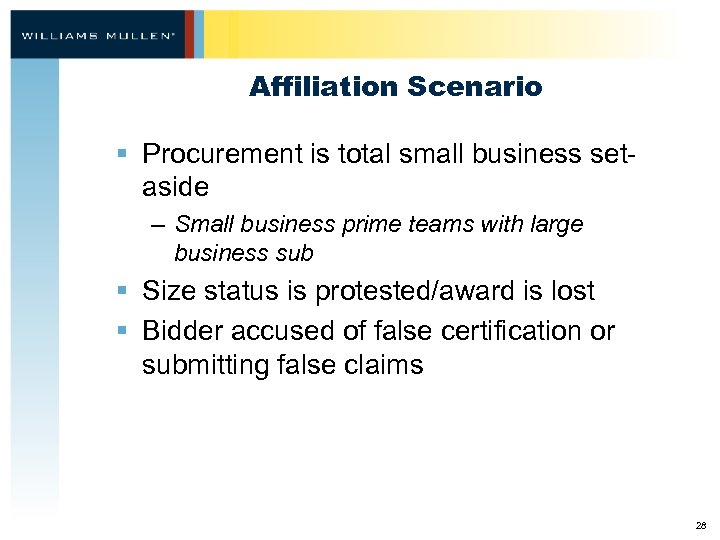 Affiliation Scenario § Procurement is total small business setaside – Small business prime teams with large business sub § Size status is protested/award is lost § Bidder accused of false certification or submitting false claims 28