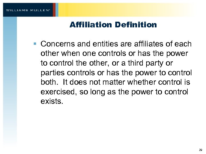 Affiliation Definition § Concerns and entities are affiliates of each other when one controls or has the power to control the other, or a third party or parties controls or has the power to control both. It does not matter whether control is exercised, so long as the power to control exists. 29