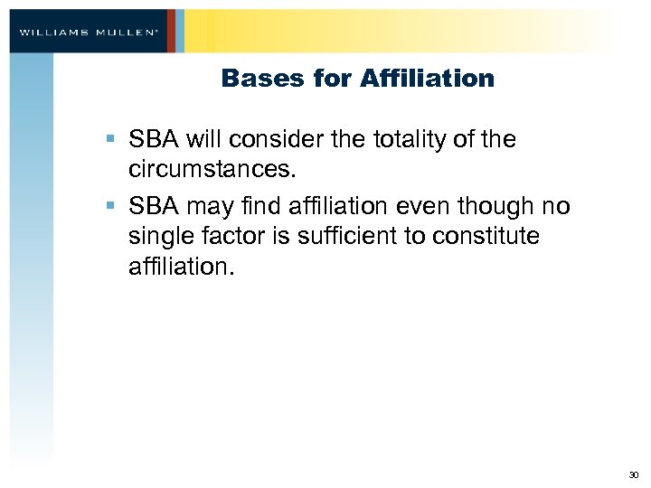Bases for Affiliation § SBA will consider the totality of the circumstances. § SBA may find affiliation even though no single factor is sufficient to constitute affiliation. 30