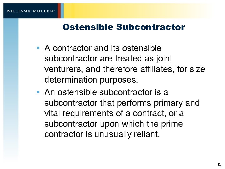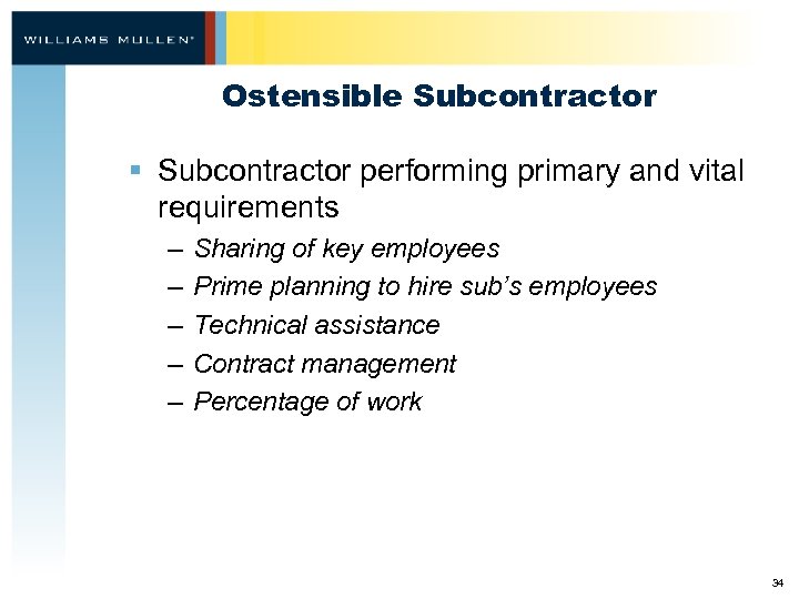 Ostensible Subcontractor § Prime contractor unusually reliant on subcontractor – – Bonding assistance (construction) Cooperation in writing the proposal Prime planning to use sub’s facilities Cooperation in performing the work 33