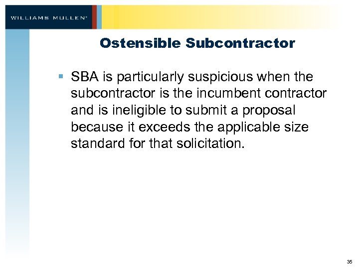 Ostensible Subcontractor § Subcontractor performing primary and vital requirements – – – Sharing of key employees Prime planning to hire sub’s employees Technical assistance Contract management Percentage of work 34