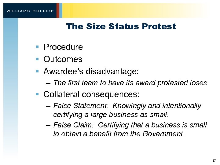 The Size Status Protest § Procedure § Outcomes § Awardee’s disadvantage: – The first team to have its award protested loses § Collateral consequences: – False Statement: Knowingly and intentionally certifying a large business as small. – False Claim: Certifying that a business is small to obtain a benefit from the Government. 37