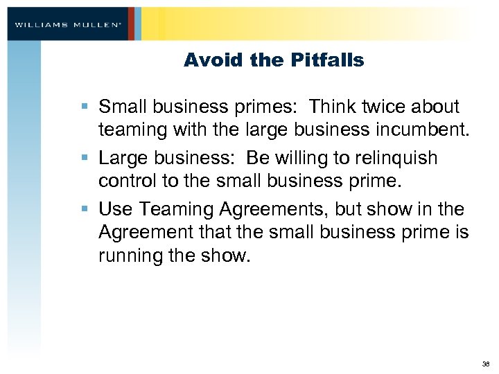 Avoid the Pitfalls § Small business primes: Think twice about teaming with the large business incumbent. § Large business: Be willing to relinquish control to the small business prime. § Use Teaming Agreements, but show in the Agreement that the small business prime is running the show. 38
