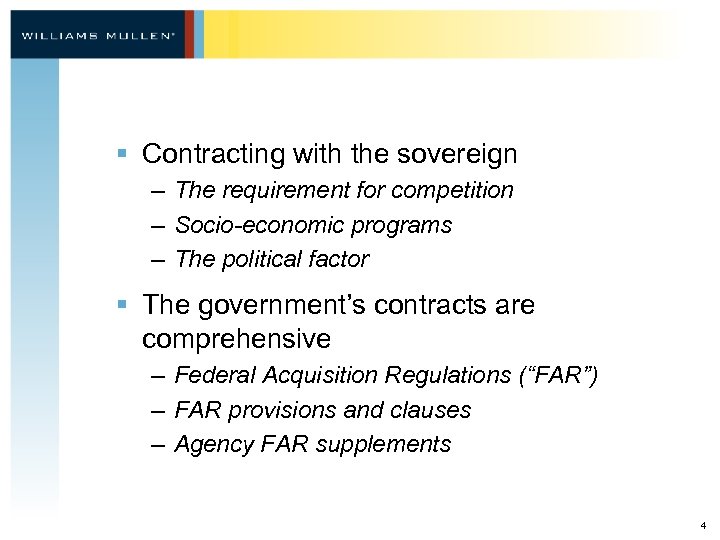 § Contracting with the sovereign – The requirement for competition – Socio-economic programs – The political factor § The government’s contracts are comprehensive – Federal Acquisition Regulations (“FAR”) – FAR provisions and clauses – Agency FAR supplements 4