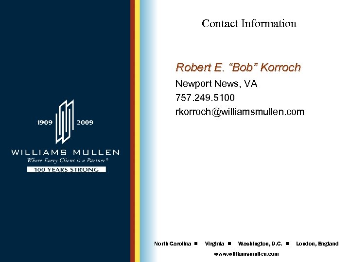 Contact Information Robert E. “Bob” Korroch Newport News, VA 757. 249. 5100 rkorroch@williamsmullen. com North Carolina n Virginia n Washington, D. C. n www. williamsmullen. com London, England