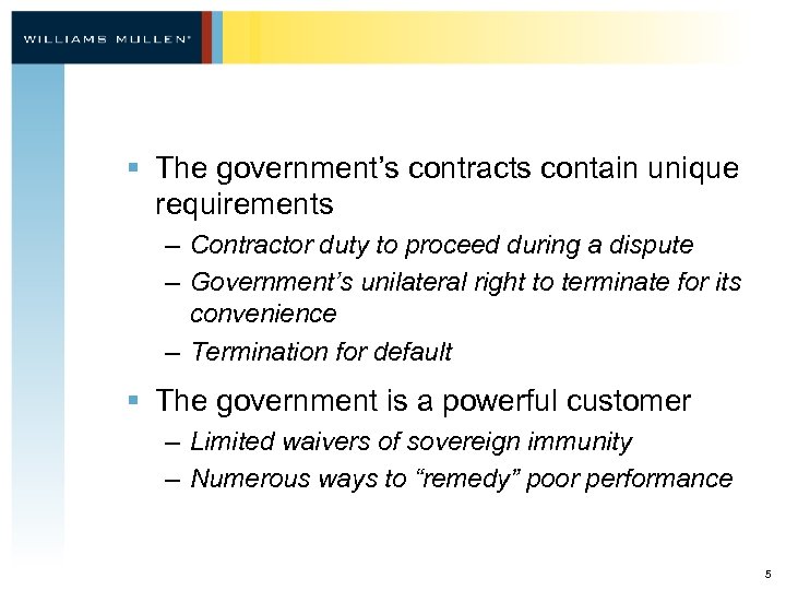 § The government’s contracts contain unique requirements – Contractor duty to proceed during a dispute – Government’s unilateral right to terminate for its convenience – Termination for default § The government is a powerful customer – Limited waivers of sovereign immunity – Numerous ways to “remedy” poor performance 5