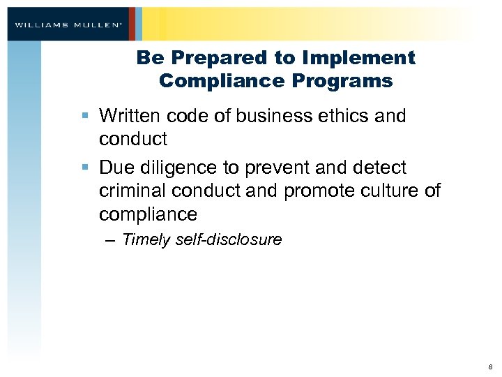 Be Prepared to Implement Compliance Programs § Written code of business ethics and conduct § Due diligence to prevent and detect criminal conduct and promote culture of compliance – Timely self-disclosure 8