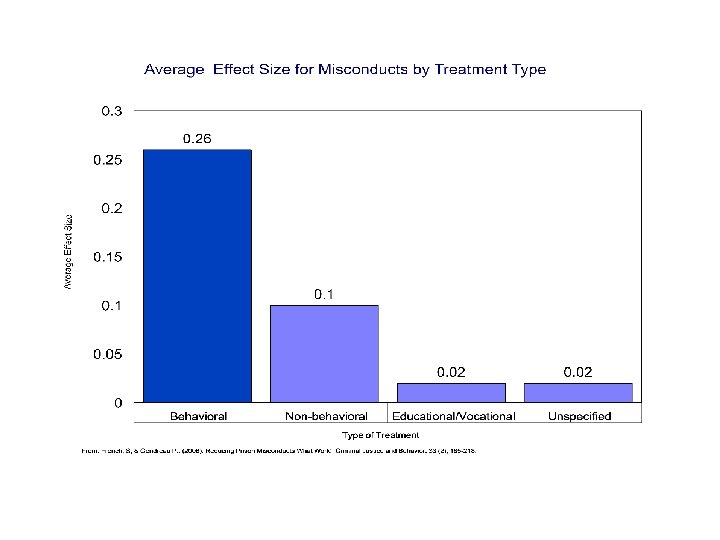Type of Treatment and Effect Sizes for Youthful Offenders 0. 25 0. 2 0. 15 Reductions in Recidivism 0. 1 0. 05 0 Non-Behavioral Effect Size 0. 04 Behavioral 0. 24 Source: Dowden and Andrews (1999), What Works in Young Offender Treatment: A Meta Analysis. Forum on Correctional Research.