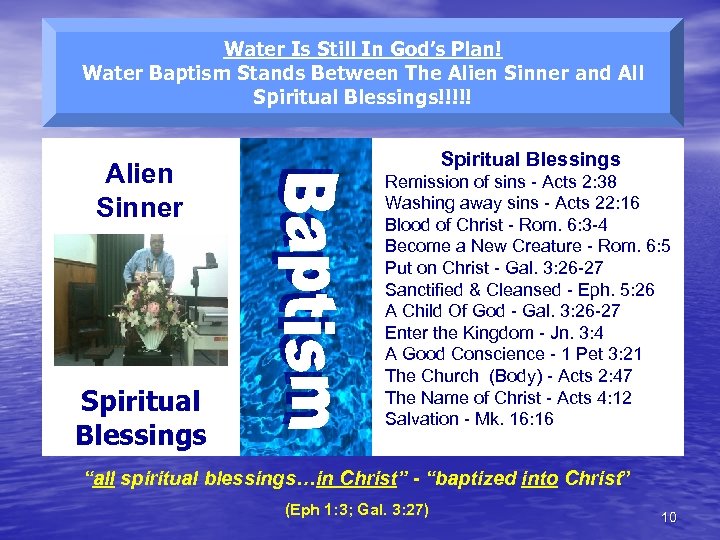 Water Is Still In God’s Plan! Water Baptism Stands Between The Alien Sinner and All Spiritual Blessings!!!!! Alien Sinner Spiritual Blessings Remission of sins - Acts 2: 38 Washing away sins - Acts 22: 16 Blood of Christ - Rom. 6: 3 -4 Become a New Creature - Rom. 6: 5 Put on Christ - Gal. 3: 26 -27 Sanctified & Cleansed - Eph. 5: 26 A Child Of God - Gal. 3: 26 -27 Enter the Kingdom - Jn. 3: 4 A Good Conscience - 1 Pet 3: 21 The Church (Body) - Acts 2: 47 The Name of Christ - Acts 4: 12 Salvation - Mk. 16: 16 “all spiritual blessings…in Christ” - “baptized into Christ” (Eph 1: 3; Gal. 3: 27) 10