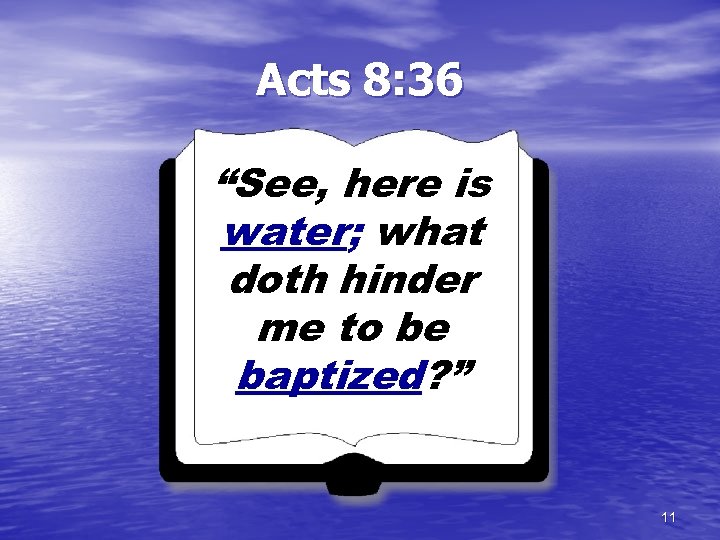 Acts 8: 36 “See, here is water; what doth hinder me to be baptized? ” 11