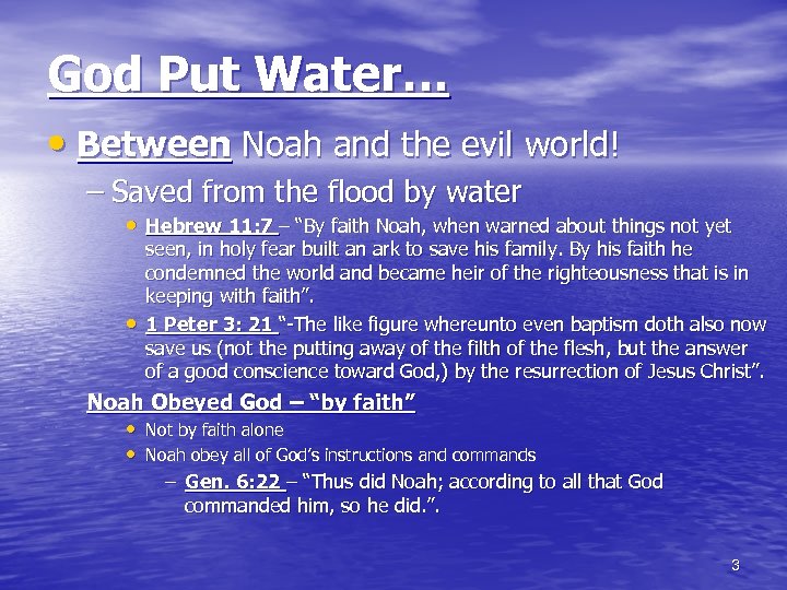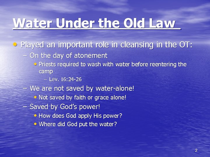 Water Under the Old Law • Played an important role in cleansing in the OT: – On the day of atonement • Priests required to wash with water before reentering the camp – Lev. 16: 24 -26 – We are not saved by water-alone! • Not saved by faith or grace alone! – Saved by God’s power! • How does God apply His power? • Where did God put the water? 2