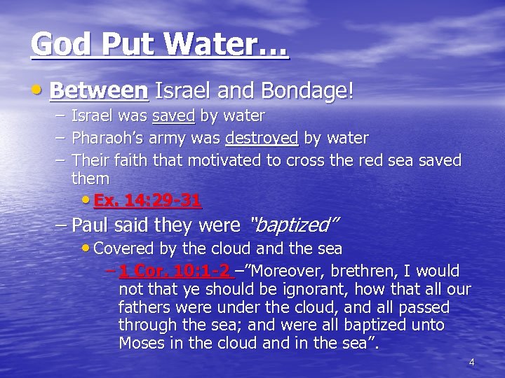 God Put Water… • Between Israel and Bondage! – Israel was saved by water – Pharaoh’s army was destroyed by water – Their faith that motivated to cross the red sea saved them • Ex. 14: 29 -31 – Paul said they were “baptized” • Covered by the cloud and the sea – 1 Cor. 10: 1 -2 –”Moreover, brethren, I would not that ye should be ignorant, how that all our fathers were under the cloud, and all passed through the sea; and were all baptized unto Moses in the cloud and in the sea”. 4