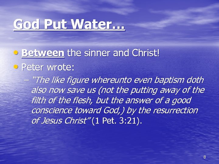 God Put Water… • Between Saul (Paul) and salvation! – The Lord told him: • “And the Lord said unto him, Arise, and go into the city, and it shall be told thee what thou must do” (Acts 9: 6). – Ananias asked: • “And now why tarriest thou? arise, and be baptized, and wash away thy sins, calling on the name of the Lord” (Acts 22: 16). 7