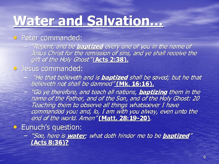 God Put Water… • Between the sinner and Christ! • Peter wrote: – “The like figure whereunto even baptism doth also now save us (not the putting away of the filth of the flesh, but the answer of a good conscience toward God, ) by the resurrection of Jesus Christ” (1 Pet. 3: 21). 8