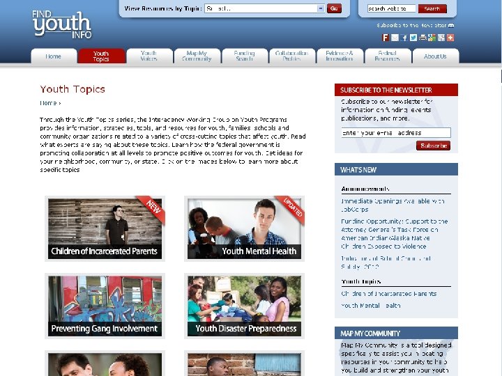 Sign up for our newsletter The map helps you find local partners, avoid 17 duplication, and fill gaps NEW Evidence & Innovation microsite Read Pathways for Youth – draft strategic plan and provide input A rotating spotlight section features special articles Stay in touch via Linked. In and You. Tube Cross-cutting youth topic information– federal work, collaborations, and summaries from the literature Interagency Working Group on Youth Programs Read the latest news from agencies – grant opportunities, reports, special events, and more.