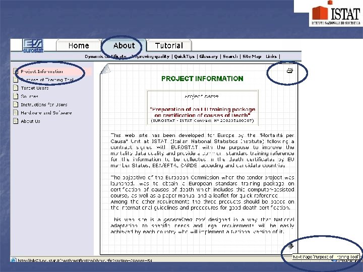 Some Web-based tool specific aspects v v v Specific attention was devoted to e-learning aspects to organize the didactic pathways and some navigation options A balance between interactivity and usability was sought in order to provide a product using the web potentiality, but not excluding non-expert users The web-tool contents definition implied: n an adaptation of what was already developed for the manual, n the definition of new specifically developed funtionality; this is particularly true for the exercises (tests and case histories). Particular attention was given to the companion documentation (guides and helps) fully integrated into the web site, in order to facilitate the use and spreading of this product; A high level of parameterization was introduced in the product: the result is in our opinion a truly “generalized” product that allow easy national adaptations. Multiple evaluations of the web-tool were performed by about 50 different European professionals including physicians, medical schools professors, IT engineers, IT programmers, e-learning experts, statisticians, nosologists, represented by SB members, experts from Italy, England, Norway, Sweden; try-out responders; EUROSTAT experts.