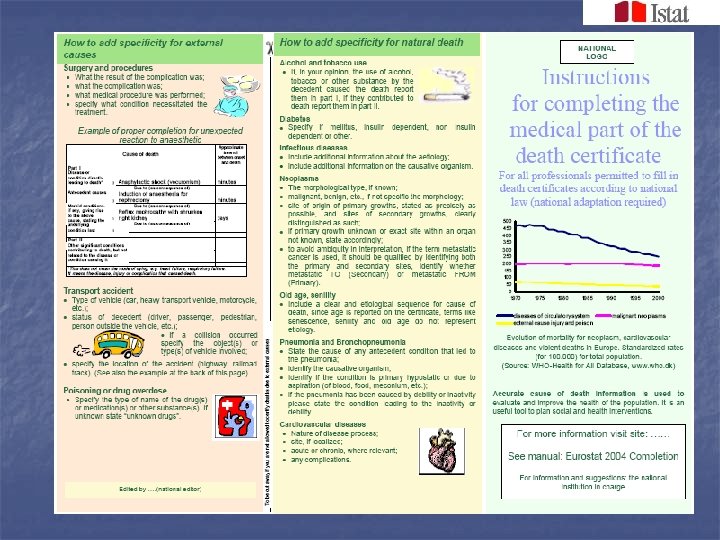 Manual main features v 5 Chapters: v Introduction v definitions and best practices v external causes of death v 54 correctly completed case histories v glossary v list of imprecise causes and hints on how to improve specificity v 4 Annexes: v National Mortality data flow (to be adapted) v Eurostat recommendations v National laws on vital statistics (to be adapted) v Short guide to National implementation v 8 Boxes: v five boxes on best certification practices v one box on how to report neoplasm v two more boxes on external causes of death (traffic accidents and accidents in medical care)