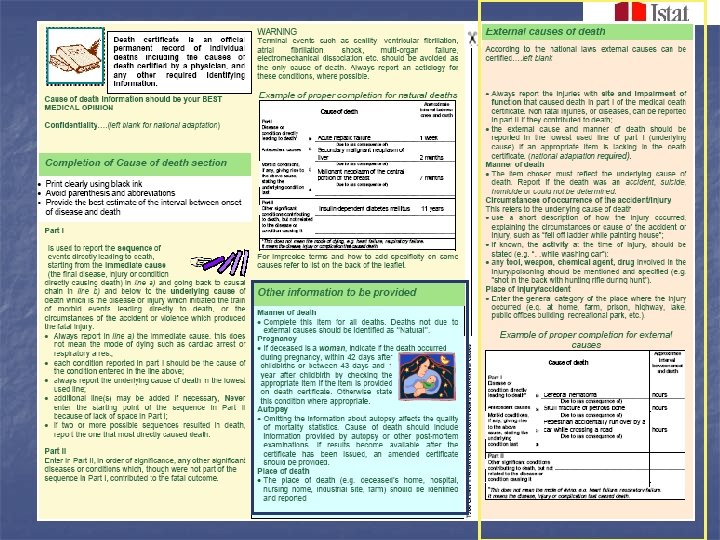 Leaflet: main features v. Single A 4 sheet of paper folded into three parts and colour printed on both pages v Can be easily protected with plastic for a prolonged use v Recall the main topics and guidelines in death certification v Only the WHO international death certificate is shown for clarity purposes v Few, relevant and useful concepts v Few, relevant and useful examples v Pleasant graphic impact: appealing and easy to remember v. Ready-to-use tool to be used in the moment of certification in order to avoid the most common mistakes v. Easy dissemination, low costs: the target should be easily reached
