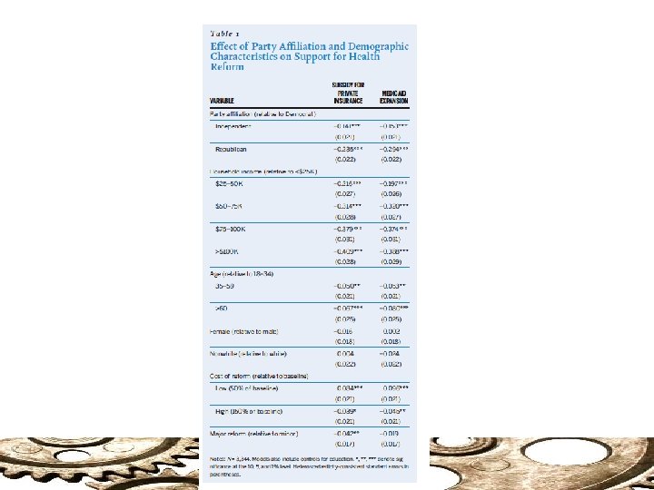 Polling Public Opinion on Health Care: Research Design: Contingent Valuation To address these limitations, Brady and Kessler conducted a large, national survey that used contingent valuation (CV) methods from environmental economics to estimate how much Americans are willing to pay to expand health insurance coverage (Kessler and Brady 2009). Analyzing Results: Regression Coefficients as Mean Differences We estimated regression models that are a function of a series of categorical variables describing each respondent’s characteristics. In this framework, coefficient estimates represent the differences in mean support across groups, holding all other respondent characteristics constant. Note: The higher the Mean Difference, the greater potential of Statistically Significant difference.