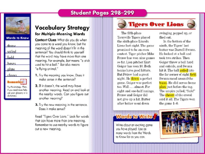 Vocabulary bases, cheers, field, plate, sailed, threw If you ran to home plate and were safe, how would you feel? If a wind blew your papers and they sailed away, what would you do? If you wanted to play baseball, what could you use to make bases?