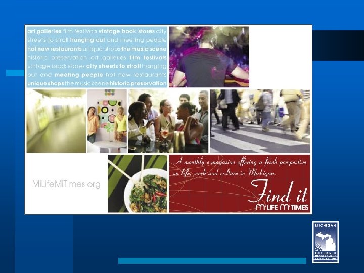 Recommendations l Feed content to michigan. org: Places to Stay; Things to Do l Prioritize new programming based on ROI, e. g. disposable income, availability of public sector funding, university relationships, etc.