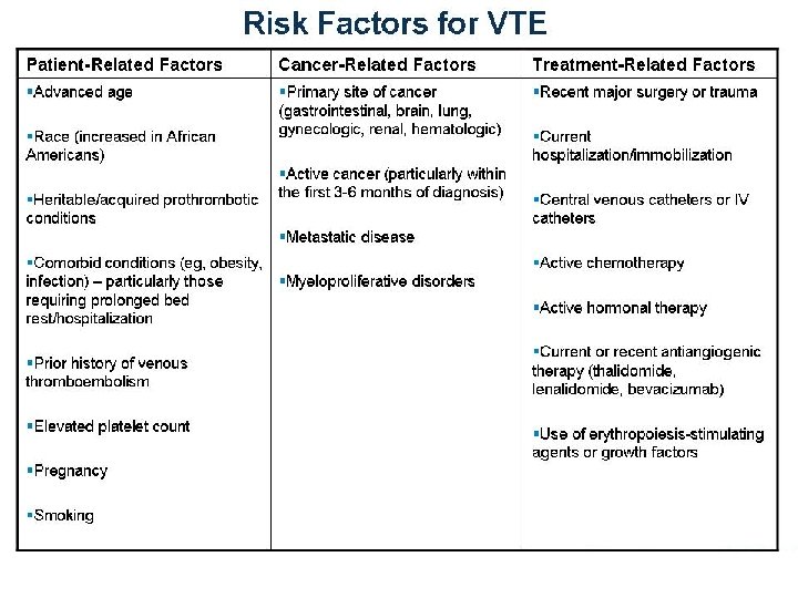 Risk factors for VTE in patients with cancer (2) G. Lyman, Cancer 2011, 117: 1334 - 49