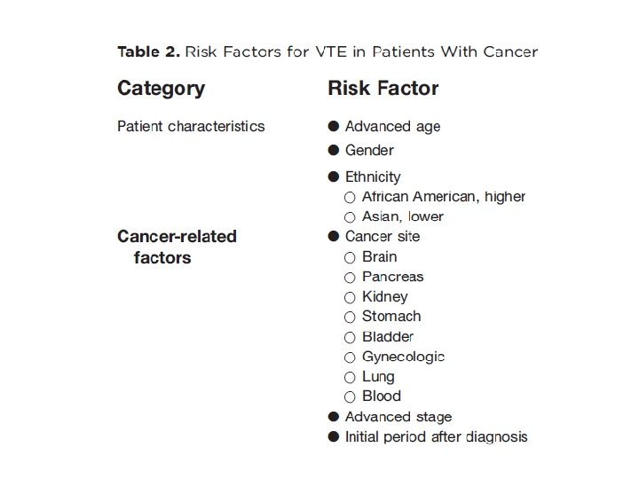 • Patient- disease- treatment related risk factors Is there are Biomarker? • - ? Biomarkers: Recent risk factors Platelet count > 350. 000 WBC >11. 000 CRP TF expression D-dimers Khorana et al. : ASCO Ed. Book, 2008