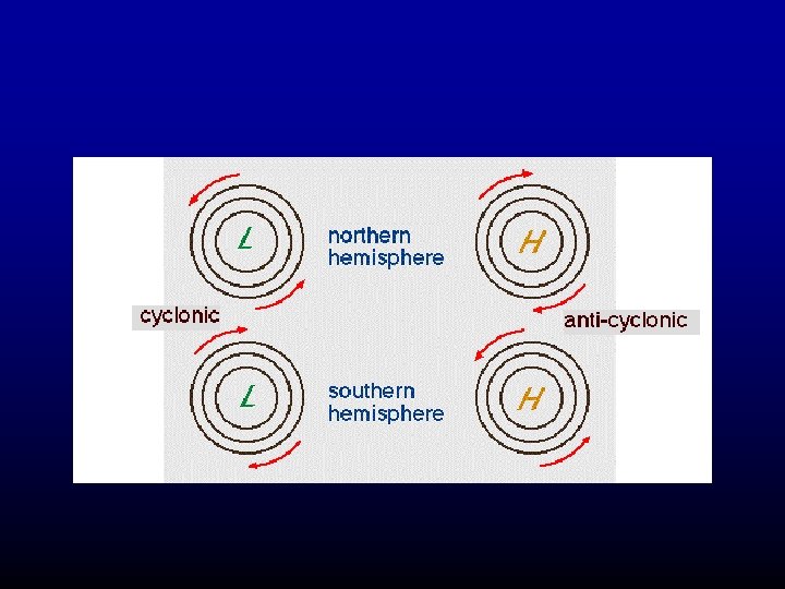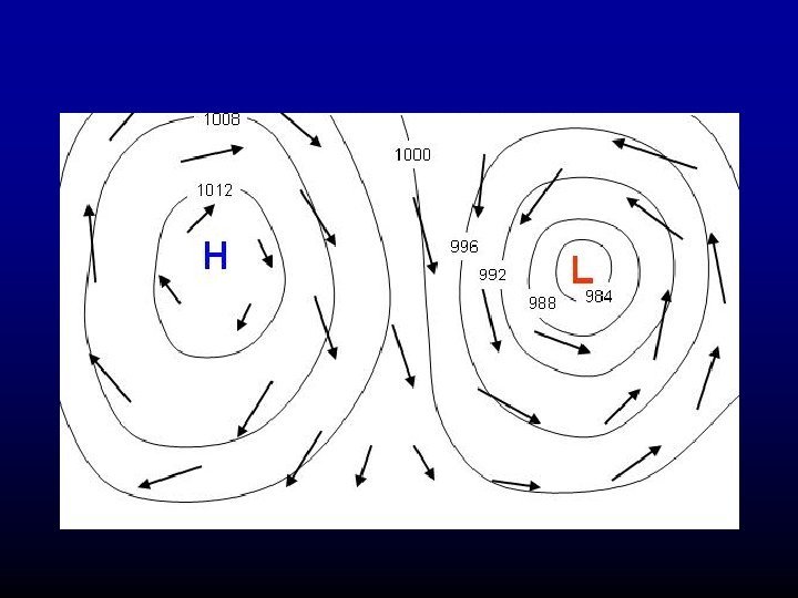In the northern hemisphere winds tend to blow countclockwise around lows and clockwise around highs (opposite in the southern hemisphere)