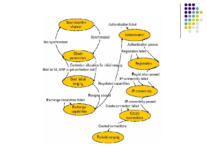 l l l b) Initial Ranging: An SS starts an Initial ranging process by sending a ranging request MAC message using the minimum transmission power. If no response is received from the BS, the SS resends the message on a subsequent frame using a higher transmission power. The response either indicates power and timing corrections that the SS must make or indicates success. Purpose: l l The process by which the SS and BS maintain the quality of RF communication link between them. When ranging finished, the BS would allocate Basic CID and Primary management CID to SS