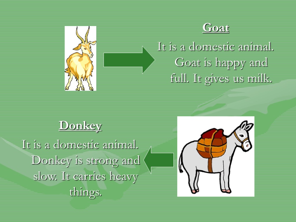 Goat It is a domestic animal. Goat is happy and full. It gives us milk. Donkey It is a domestic animal. Donkey is strong and slow. It carries heavy things.