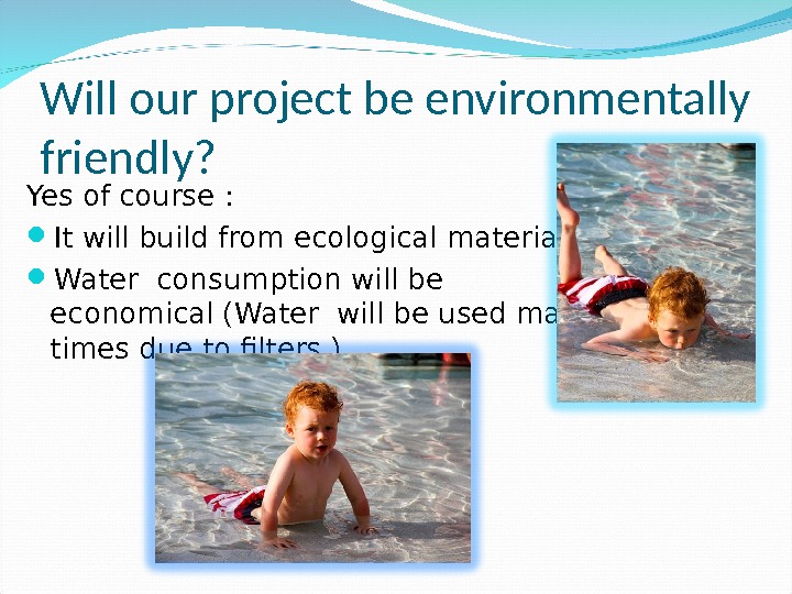 Will our project be environmentally friendly? Yes of course : It will build from ecological materials Water consumption will be economical (Water will be used many times due to filters )