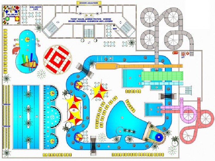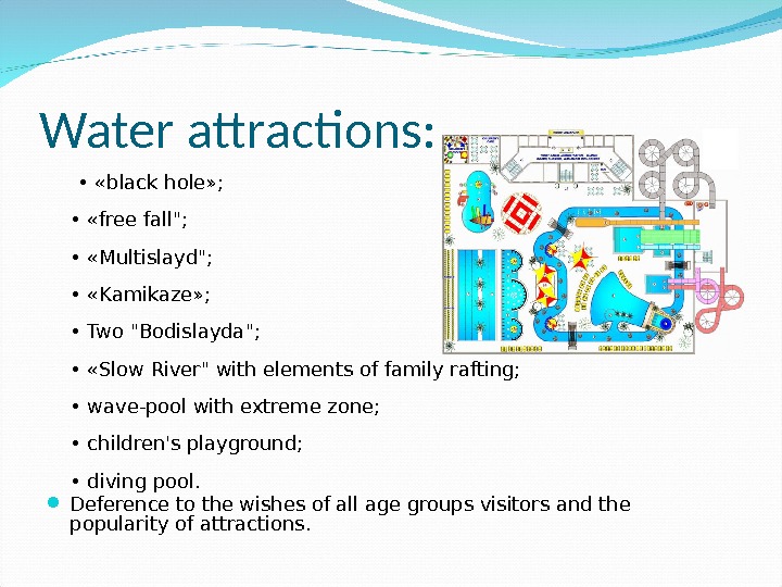 Water attractions: • «black hole» ; • «free fall»; • «Multislayd»; • «Kamikaze» ; • Two»Bodislayda»; • «Slow. River»with elements offamilyrafting; • wave-poolwithextremezone; • children’s playground; • divingpool. Deference to the wishesof all agegroups visitorsand the popularityof attractions.