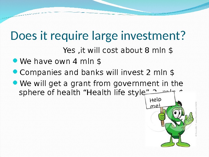 Does it require large investment? Yes , it will cost about 8 mln $ We have own 4 mln $ Companies and banks will invest 2 mln $ We will get a grant from government in the sphere of health “Health life style”-2 mln $ Help me!