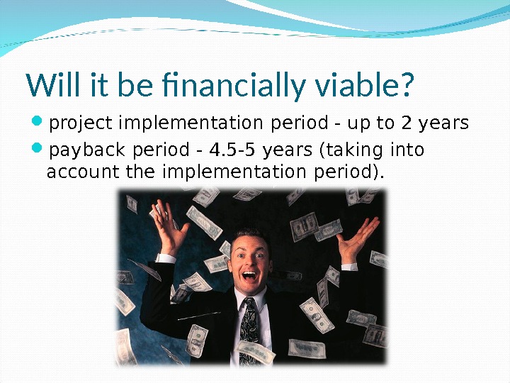 Will it be financially viable? project implementation period- up to 2 years payback period -4. 5 -5 years (taking into account the implementation period).